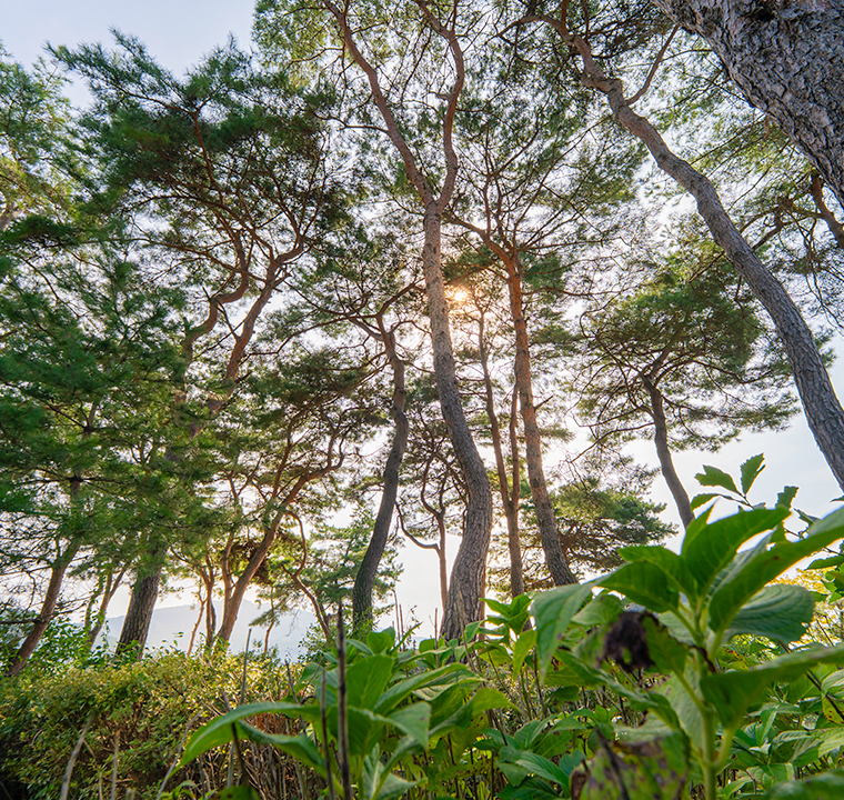 햇살이 솔잎 사이로 스며들면 정원은 따스한 빛으로 물듭니다.